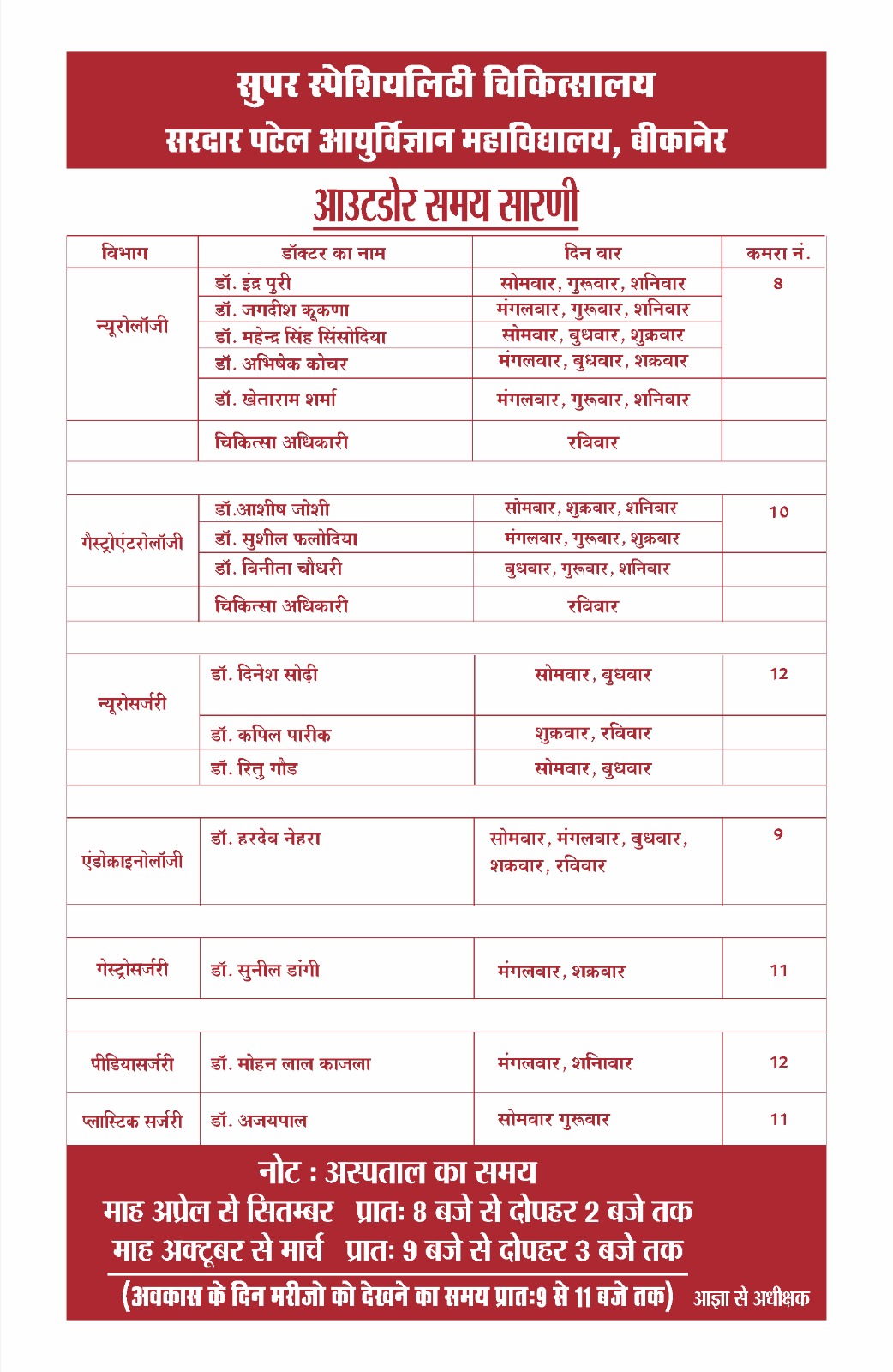 तहलका न्यूज,बीकानेर।खाद्य एवं नागरिक आपूर्ति मंत्री सुमित गोदारा की अध्यक्षता में 3 जनवरी को सुपर स्पेशलिटी ब्लॉक में आयोजित बैठक के दौरान दिए गए निर्देशों की अनुपालना में सुपर स्पेशलिटी ब्लॉक अधीक्षक डॉ.संजीव बुरी द्वारा एसएसबी के आउटडोर की नई समय सारिणी निर्धारित की गई है।डॉ.बुरी ने बताया कि खाद्य मंत्री ने बैठक के दौरान एसएसबी की व्यवस्थाओं की समीक्षा की तथा प्रत्येक आउटडोर सातों दिन चलाने तथा इनमें विशेषज्ञ चिकित्सकों की ड्यूटी निर्धारित करने के निर्देश दिए थे। जिसकी अनुपालना में मंगलवार को अधीक्षक डॉ.बुरी ने समय सारिणी के आदेश जारी किए तथा अस्पताल में इसे डिस्प्ले कर दिया गया है। इसके अनुसार अप्रैल से सितंबर तक अस्पताल का समय प्रातः 8 से दोपहर 2 बजे तक तथा अक्टूबर से मार्च तक प्रातः 9 से दोपहर 3 बजे तक रहेगा। अवकाश के दिन चिकित्सकों द्वारा प्रातः 9 से 11 बजे तक मरीज को देखा जाएगा।डॉ.बुरी ने बताया कि कमरा नंबर 8 न्यूरोलॉजी आउटडोर में डॉ.इंद्र पुरी सोमवार,गुरुवार और शनिवार को,डॉ.जगदीश कूकणा मंगलवार,गुरुवार और शनिवार को,डॉ.महेंद्र सिंह सिसोदिया सोमवार, बुधवार और शुक्रवार को,डॉ.अभिषेक कोचर मंगलवार,बुधवार और शुक्रवार को तथा डॉ.खेताराम शर्मा मंगलवार,गुरुवार और शनिवार मरीजों को देखेंगे। वहीं गैस्ट्रोएंटरोलॉजी विभाग के कमरा नंबर 10 में डॉ.आशीष जोशी सोमवार, शुक्रवार तथा शनिवार को,डॉ. सुशील फलोदिया मंगलवार,गुरुवार तथा शुक्रवार को एवं डॉ.विनीता चौधरी बुधवार,गुरुवार और शनिवार की सेवाएं रहेंगी।वहीं न्यूरोसर्जरी विभाग के कमरा नंबर 12 में डॉ.दिनेश सोढ़ी सोमवार और बुधवार को, डॉ.कपिल पारीक शुक्रवार और रविवार को तथा डॉ.ऋतु गौड़ सोमवार और बुधवार को मरीजों को देखेंगे।इसी प्रकार एंडोक्राइनोली विभाग कमरा नंबर 9 में डॉ.हरदेव नेहरा सोमवार,मंगलवार,बुधवार,शुक्रवार तथा रविवार को मरीज को देखेंगे। गैस्ट्रो सर्जरी विभाग के कमरा नंबर 11 में डॉ. सुनील डांगी मंगलवार और शुक्रवार को, पीडियासर्जरी विभाग के कमरा नंबर 12 में डॉ. मोहनलाल काजला मंगलवार और शनिवार तथा प्लास्टिक सर्जरी विभाग में के कमरा नंबर 11 में डॉ. अजयपाल सोमवार और शुक्रवार को अपनी सेवाएं देंगे।