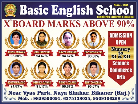 तहलका न्यूज,बीकानेर। नयाशहर स्थित बेसिक इंग्लिश स्कूल का इस वर्ष का परीक्षा परिणाम बेहद उत्कृष्ट रहा। विद्यालय के विद्यार्थियों ने शानदार प्रदर्शन करते हुए संस्था का नाम रोशन किया।कक्षा 10 बोर्ड परीक्षा में आयुष तंवर ने 96.50 प्रतिशत अंक प्राप्त कर प्रथम स्थान हासिल किया।वहीं गुंजन सोनी और काव्या मंडन ने 94.67-94.67 प्रतिशत अंक प्राप्त कर संयुक्त रूप से दूसरा स्थान प्राप्त किया। विद्यालय के डायरेक्टर नारायण व्यास ने बताया कि इस वर्ष कक्षा 10 का परिणाम शत-प्रतिशत रहा। कुल 60 विद्यार्थियों में से 57 ने प्रथम श्रेणी,1 ने द्वितीय श्रेणी,1 ने तृतीय श्रेणी और 1 छात्र सप्लीमेंट्री में रहा।इसी प्रकार कक्षा 8 के परिणाम में भी विद्यार्थियों का प्रदर्शन सराहनीय रहा,जहां 84 विद्यार्थियों में से 55 ने ए ग्रेड, 29 ने बी ग्रेड प्राप्त किया,जबकि सी ग्रेड में कोई भी विद्यार्थी नहीं रहा।कक्षा 5 के परीक्षा परिणाम में कुल 88 विद्यार्थियों में से 38 ने ए ग्रेड, 42 ने बी ग्रेड और 8 ने सी ग्रेड प्राप्त कर सफलता हासिल की।डायरेक्टर नारायण व्यास ने सभी विद्यार्थियों, अभिभावकों एवं शिक्षकों को इस उत्कृष्ट परिणाम के लिए बधाई देते हुए कहा कि विद्यालय आगे भी इसी तरह गुणवत्तापूर्ण शिक्षा के लिए प्रतिबद्ध रहेगा।