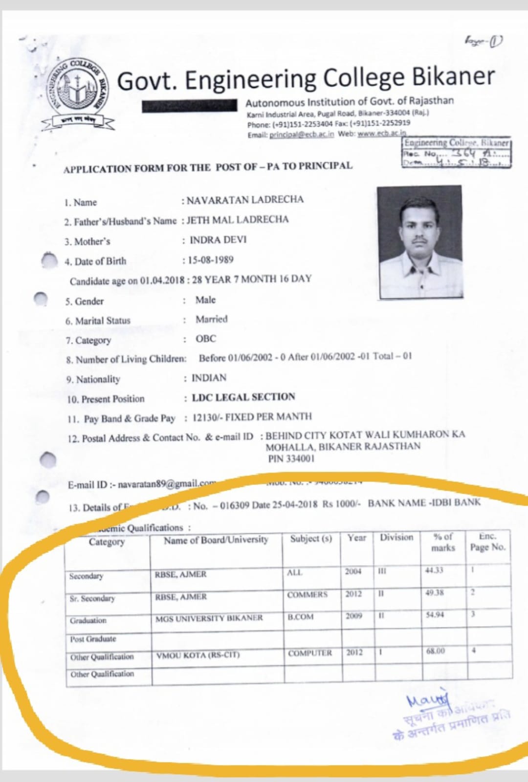 तहलका न्यूज,बीकानेर।आमतौर पर किसी भी डिग्री या डिप्लोमा प्रमाण पत्र हासिल करने के लिये सीढ़ी दर सीढ़ी कक्षाओं को पास करना पड़ता है।कभी भी कोई विद्यार्थी पहले स्नातक की डिग्री हासिल कर 12 वीं बोर्ड की परीक्षा पास करें।ऐसा कम ही सुनने को आता है। किन्तु इंजीनियरिंग कॉलेज के एक कार्मिक ने ऐसा कमाल कर दिखाया है।मजे की बात तो यह है कि उन्होंने एक ही वर्ष में दो-दो डिग्रीयां भी हासिल की है।अब ये ही कार्मिक ईसीबी प्राचार्य के पीए बन उनके सलाहाकार की भूमिका निभा रहे है।बताया जा रहा है कि नवरत्न लदरेचा नाम के इस कार्मिक की इस प्रतिभा का उजागर कॉलेज की ओर दी गई सूचना के अधिकार की जानकारी में हुआ है।