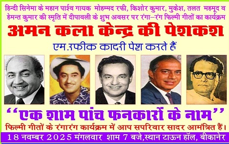 तहलका न्यूज,बीकानेर।अमन कला केंद्र द्वारा आगामी 18 नवम्बर को टाउन हॉल में शाम 6 30 बजे हिन्दी सिनेमा के जाने-माने पार्श्व गायक मोहम्मद रफी मुकेश किशोर कुमार तलत महमूद हेमंत कुमार की याद में एक शाम पांच फन कारों के नाम कार्यक्रम आयोजित किया जाएगा संस्था अध्यक्ष एम रफीक कादरी ने बताया कि कार्यक्रम के मुख्य अतिथि अरविन्द मिढ़ा उपाध्यक्ष शहर कांग्रेस कमेटी होंगे अध्यक्षता संयुक्त रूप से एन डी रंगा अध्यक्ष सखा संगम व अहमद हारून कादरी डी एफ ओ वन विभाग करेंगे विशिष्ट अतिथि एमआर मुग़ल डॉ सीताराम गोठवाल डॉ प्रवीण चतुर्वेदी सचिन भाटिया डॉ पी के सरीन डॉ दिनेश शर्मा डॉ हिमांशु दाधीच डॉ योगेश साध समुद्र सिंह राठौड़ मो सदीक चौहान डॉ भूपेंद्र तिवाड़ी डॉ राकेश रावत एम आर कुकरेजा होंगे संस्था सचिव अनवर अजमेरी ने बताया कि कार्यक्रम में बीकानेर के जाने-माने गायक कलाकार अपने गीत प्रस्तुत करेंगे संचालन एम रफीक कादरी करेंगे।